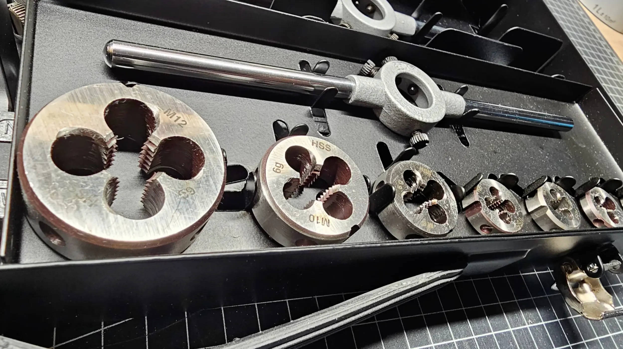 Nel set abbiamo sette filiere a norma DIN 223 (M3, M4, M5, M6, M8, M10, M12) e solo cinque girafiliere. Perché? Guardando i girafiliere troviamo incisioni come 20x5, 20x7, 25x9, 30x11, 38x14. Il primo numero indica il diametro della filiera alloggiabile, il secondo l'altezza utile interna.